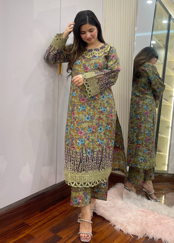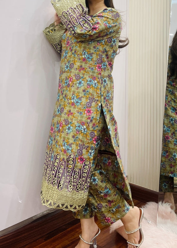 Bottom Style Straight trouser Color Type Sage green Lining Attached As shown in picture Number Of Pieces 2 piece - top & bottom Product Type Daily/basic wear Season All season Shirt Fabric Cambric Top Style Straight cut kurta Trouser Fabrics Cambric Work Technique Embroidered